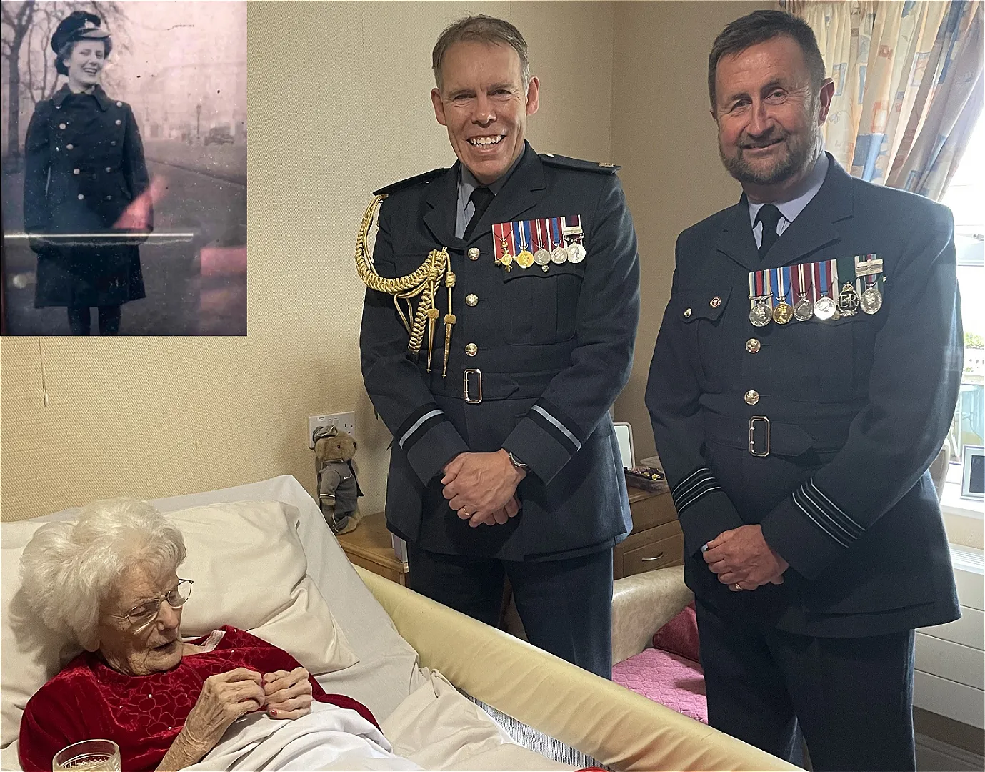 Finola Pickwell then had the great pleasure of witnessing Wing Commander Stephen Fry (Deputy Lord Lieutenant of West Glamorgan) and Air Commodore Robert Woods (Air Officer Wales) presenting Kathleen with a replacement for her long-lost King’s Loyal Service Medal.