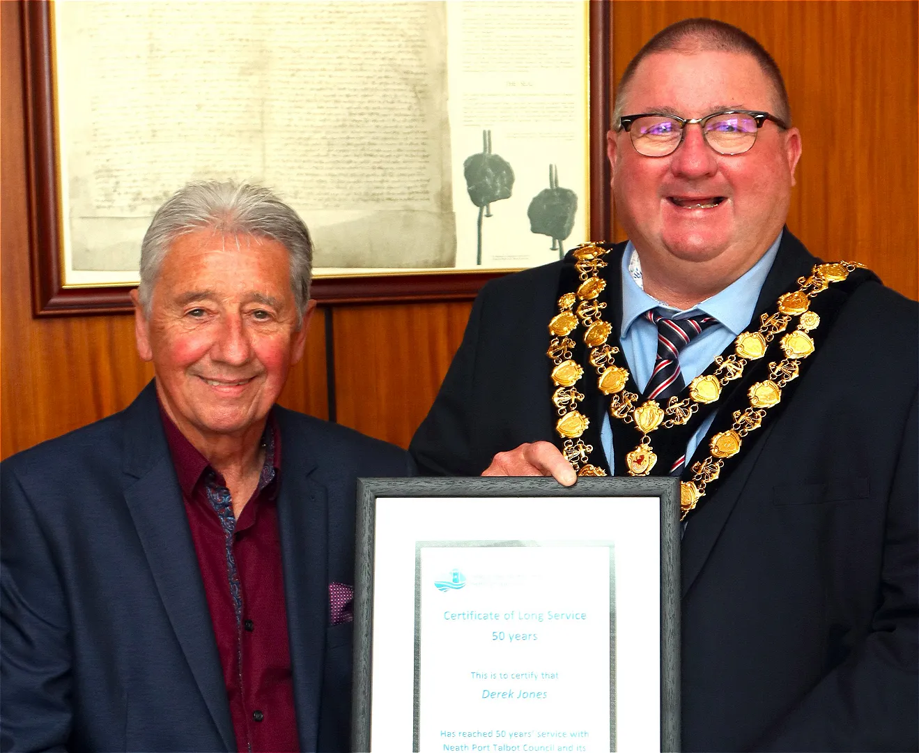 On Tuesday, July 2nd, 2024, Derek was thanked for his half century of service by the Mayor of Neath Port Talbot, Cllr Matthew Crowley, in a reception at the Mayor’s Parlour in Neath Port Talbot Council’s Civic Centre.