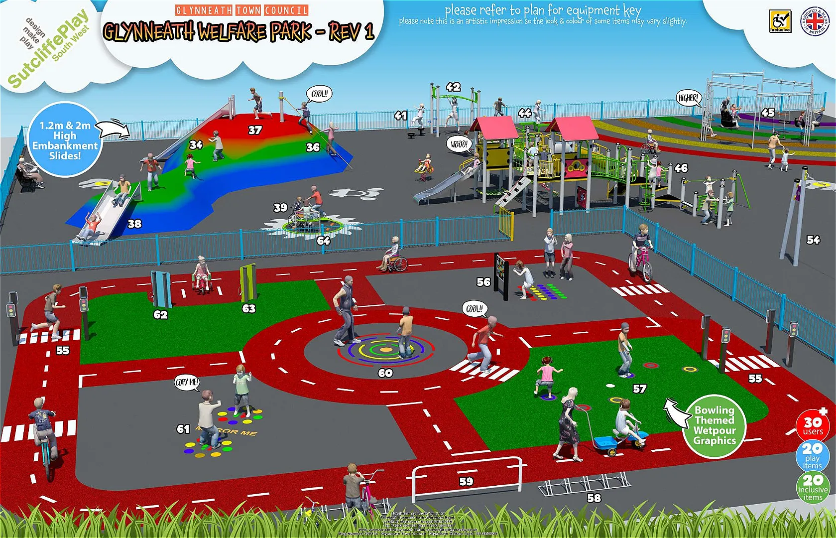 The ambitious ‘Phase One’ of the project, valued at £817,860, will introduce a range of new and improved facilities. The existing bowls green will be replaced with a children’s park, tailored to young adventurers up to eleven years old. The new play equipment will include swings, zip-wires, trampolines, a see-saw, an inclusive roundabout, a multi-play unit, rope course and wet-pour ‘roadway’ where children can practice their cycling and scooter skills.